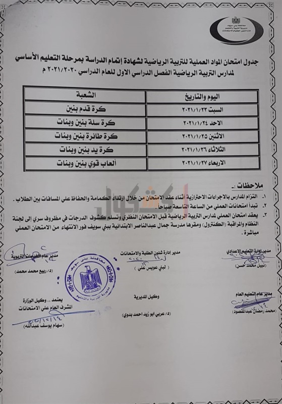 للتربية الرياضية للشهادة الإعدادية لمدارس التربية الرياضية يوم السبت 23 يناير وتنتهى