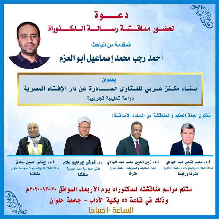 وتتكون لجنة المناقشة والحكم من الدكتور شوقي ابراهيم علام مفتي الجمهورية، مناقشا، الدكتور محمد فتحي عبدالهادي أستاذ المكتبات والمعلومات بجامعة القاهرة، مشرفا ورئيسا، والدكتور زين الدين محمد عبدالهادي أستاذ المكتبات والمعلومات بجامعة حلوان، مشرفا، والدكتورة إيناس حسين صادق أستاذ المكتبات والمعلومات بجامعة حلوان مناقشا.