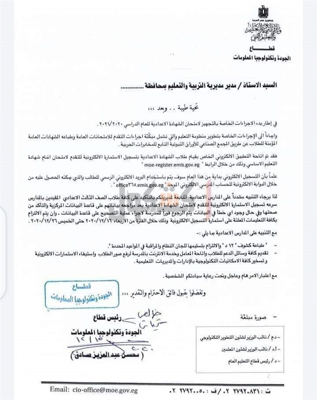 يبدأ طلاب الصف الثالث الإعدادي؛ اليوم الأربعاء الموافق 16 ديسمبر 2020 التسجيل بالاستمارة الإلكترونية لامتحانات الفصل الدراسي الأول للعام الدراسي 2020/2021.