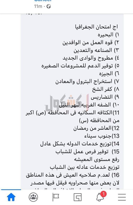تداول عدد من طلاب الصف الأول الثانوي صورًا من الامتحان التجريبي بمادة الجغرافيا، وتظهر بالصور المتداولة إجابات الأسئلة بالاختبار التدريبي، عبر أحد الجروبات التعليمية على موقع التواصل الاجتماعي«الفيس بوك».