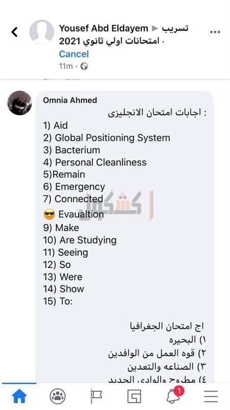 تداول عدد من طلاب الصف الأول الثانوي صورًا من الامتحان التجريبي بمادة اللغة الأجنبية الأولى «الانجليزي»، حيث ظهرت الاجابات بالصور المتداولة للاختبار التدريبي، عبر أحد الجروبات التعليمية على موقع التواصل الاجتماعي«الفيس بوك».
