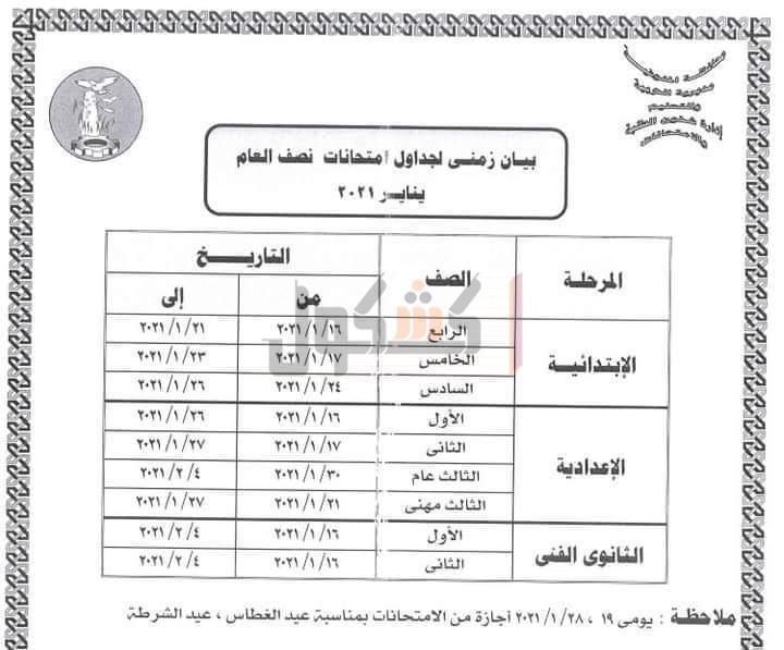 هذا وقد أوضح الدكتور أحمد سويد وكيل وزارة التربية والتعليم بالمنوفية أن امتحانات الصف الرابع الإبتدائي ستبدأ يوم السبت 16 يناير المقبل وحتي الخميس الموافق 21 يناير 2021 ، مضيفاً أن اختبارات الصف الخامس الابتدائي ستبدأ يوم الأحد ١٧ يناير وتستمر حتى يوم السبت ٢٣ يناير ، وستبدأ اختبار الصف السادس الابتدائي يوم الأحد 24 يناير وتستمر حتي يوم الثلاثاء 26 يناير 2021 .