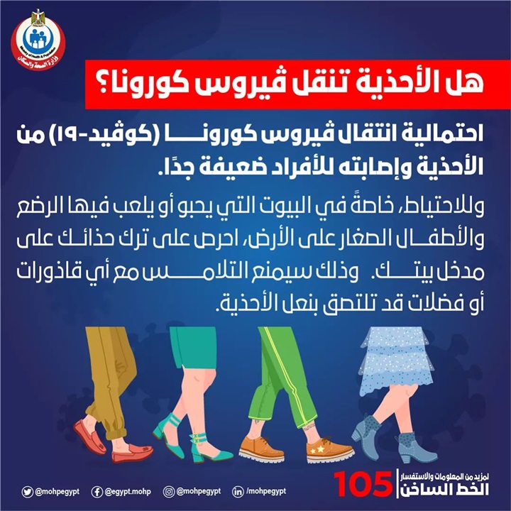 تسائل العديد من رواد مواقع التواصل الاجتماعي، "هل فيروس كورونا يمكن أن ينتقل عبر الأحذية من الشوارع إلى المنازل؟"، وبالتالي تنتشر العدوى الفيروسية داخل المنزل، لذا قامت وزارة الصحة والسكان بالرد على هذا التسائل.