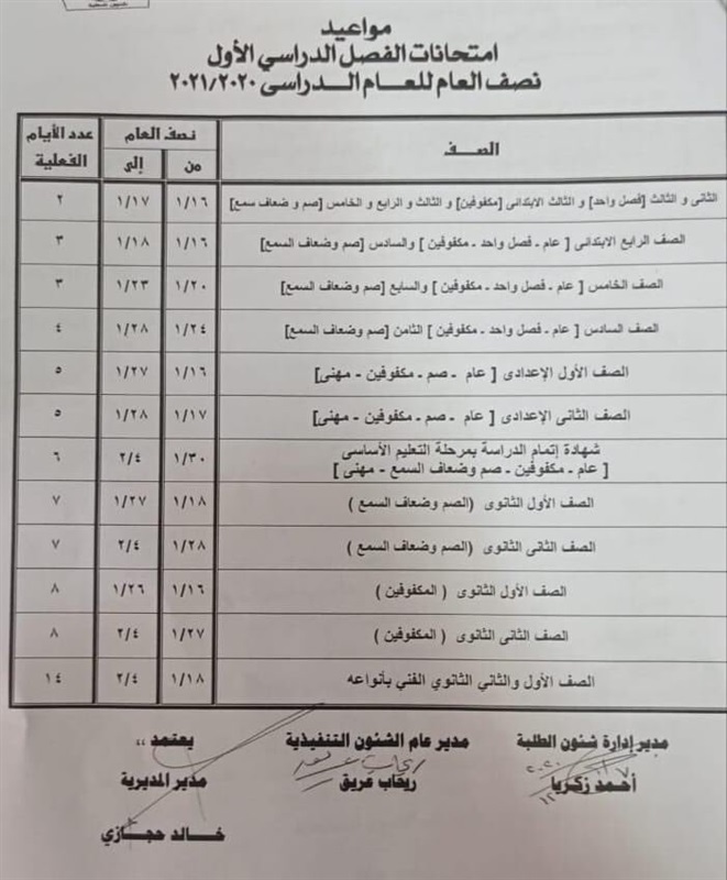 أعتمد اللواء أحمد راشد محافظ الجيزة عصر اليوم ، جدول امتحانات نصف العام لشهادة الإعدادية ، وبصفوف النقل.