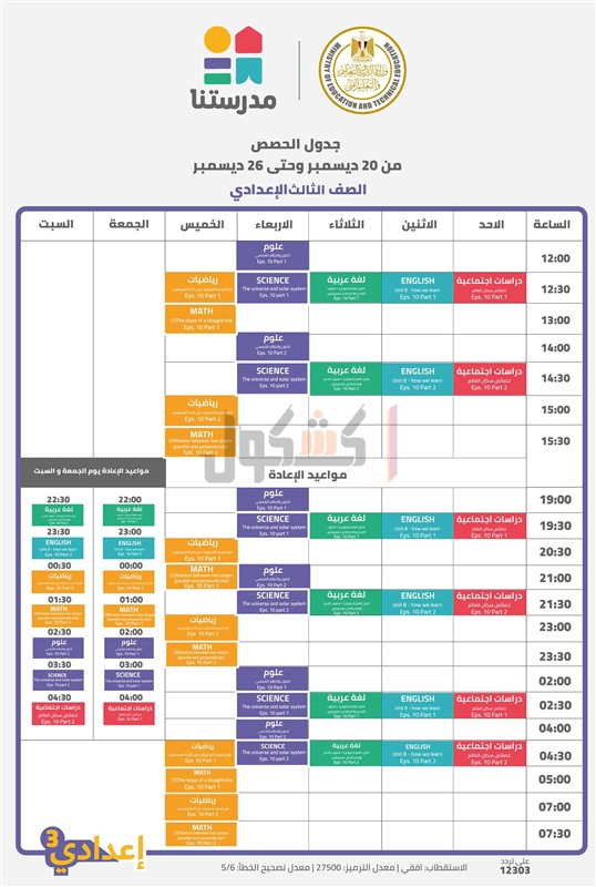 جدول مواعيد عرض الدروس الأسبوعي لطلاب الإعدادية الأزهرية من 20 حتى 25 ديسمبر