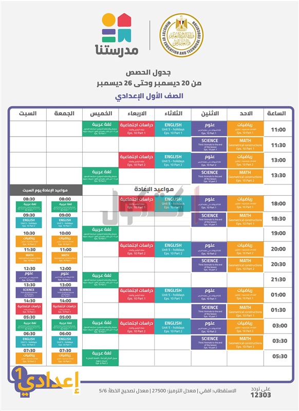 من الصف الأول الاعدادى حتى الثالث الإعدادى على القناة التعليمية "مدرستنا"