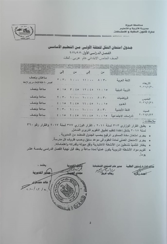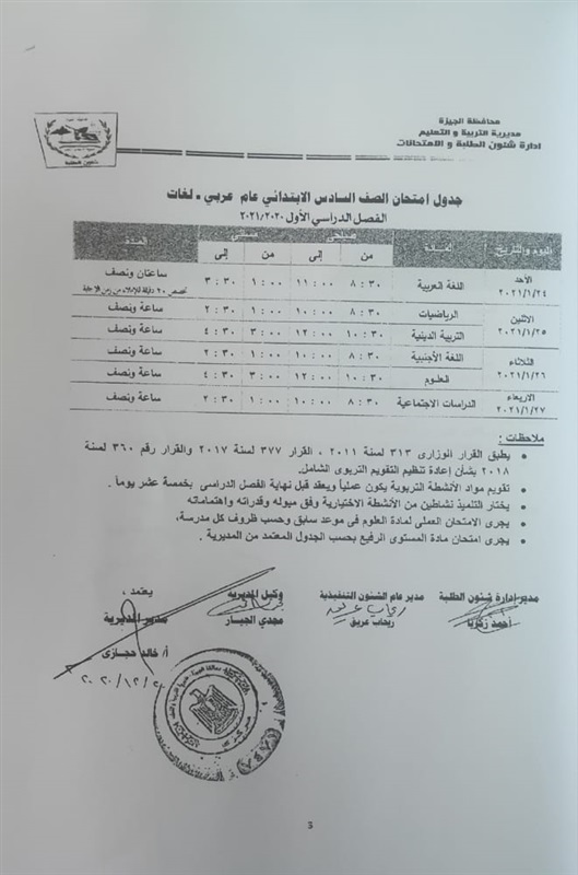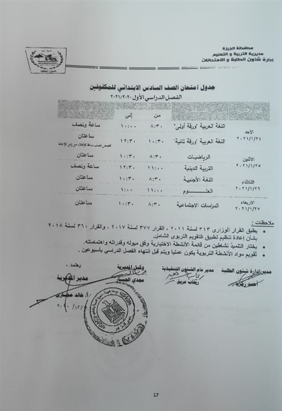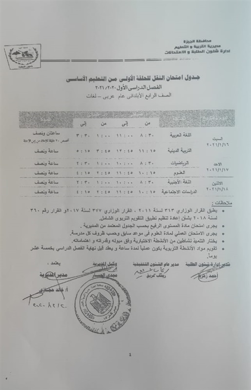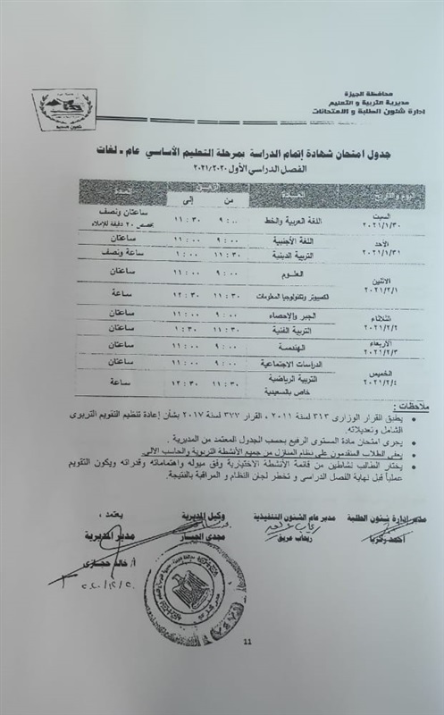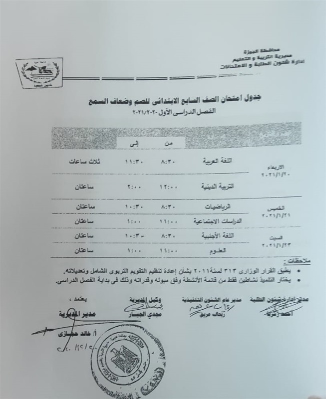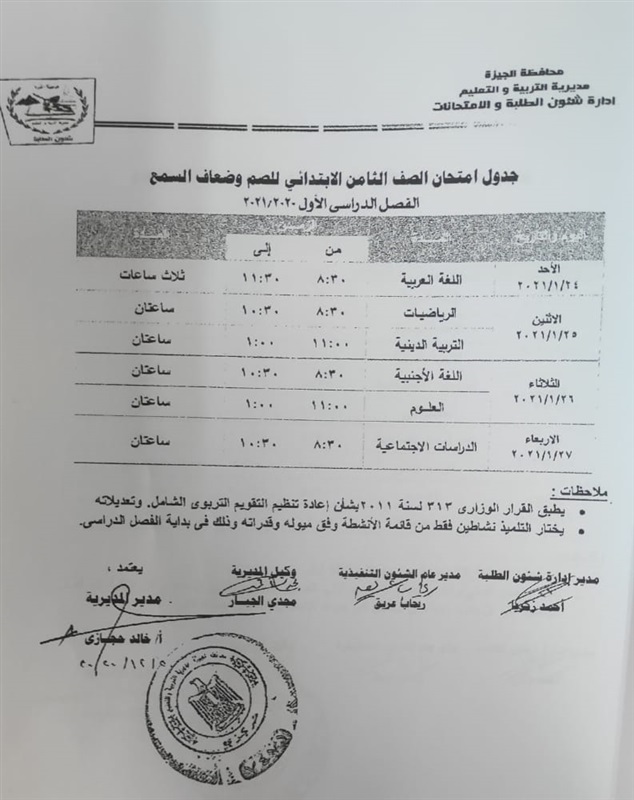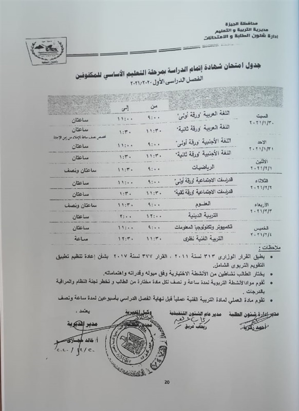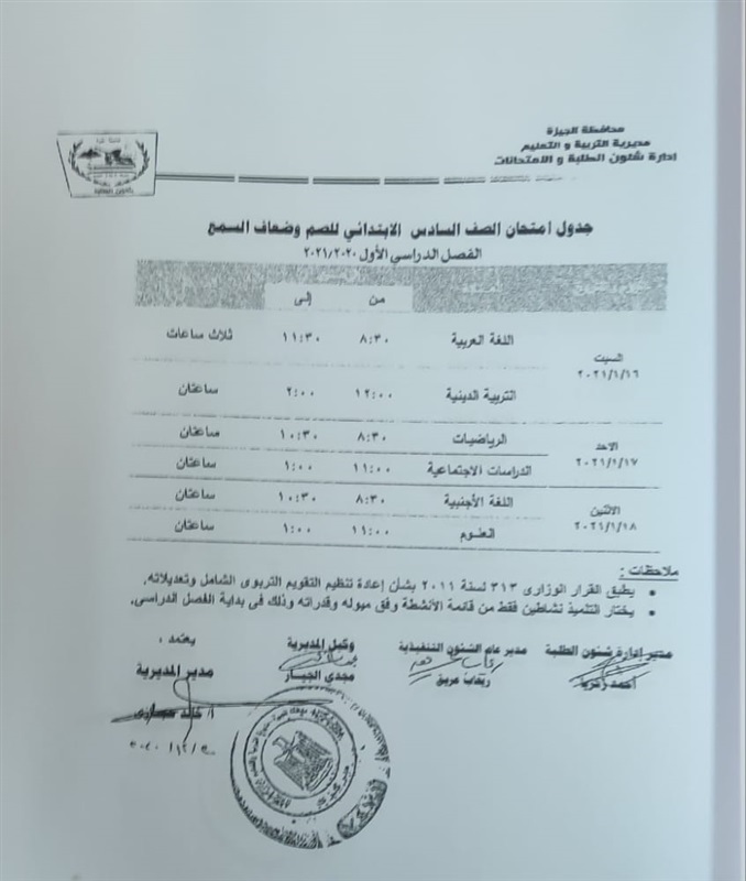 أعلنت مديرية التربية والتعليم في محافظة الجيزة جداول الامتحانات للفصل الدراسي الأول لكل الصفوف الدراسية للتعليم الاساسي العام عربي واللغات وللفترات الصباحية والمسائية والتعليم المهني والتعليم المجتمعي والصم وضعاف السمع والمكفوفين؛ للعام الدراسي 2020/2021.