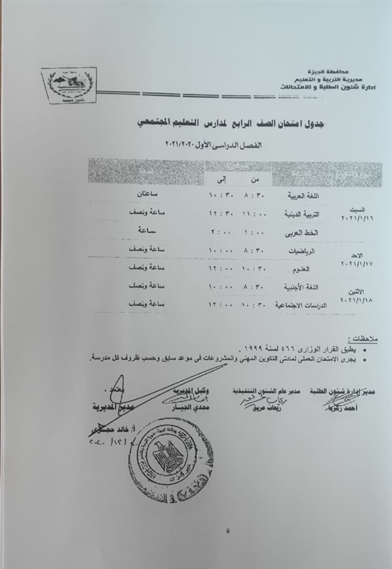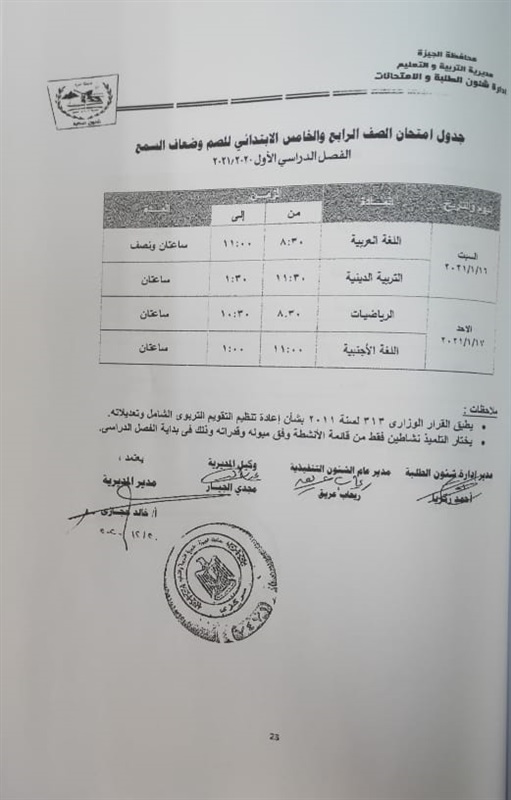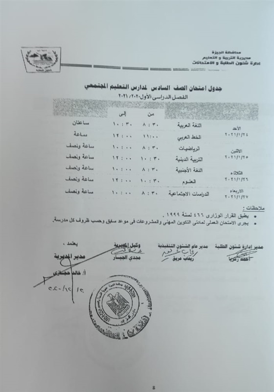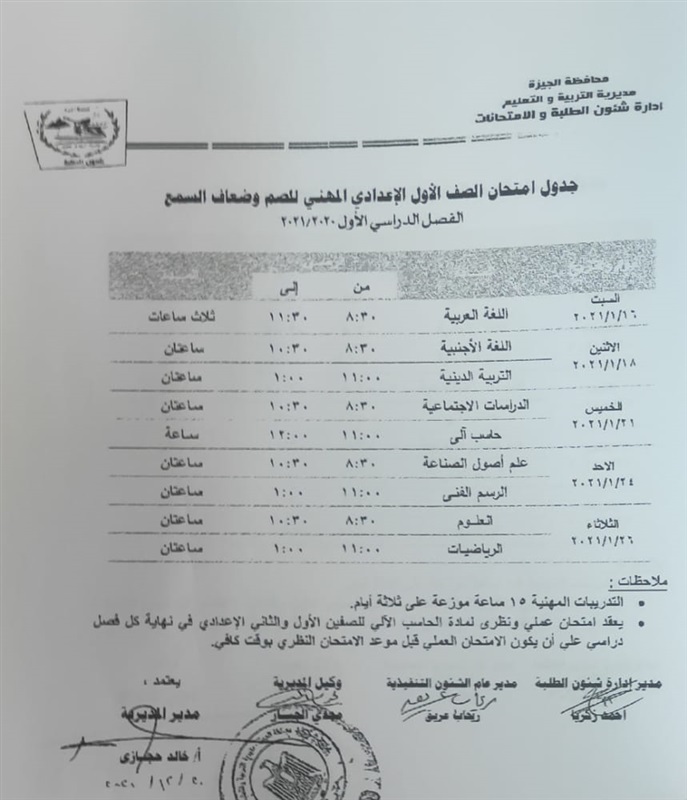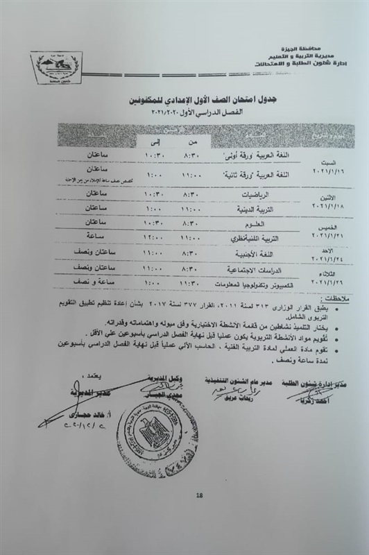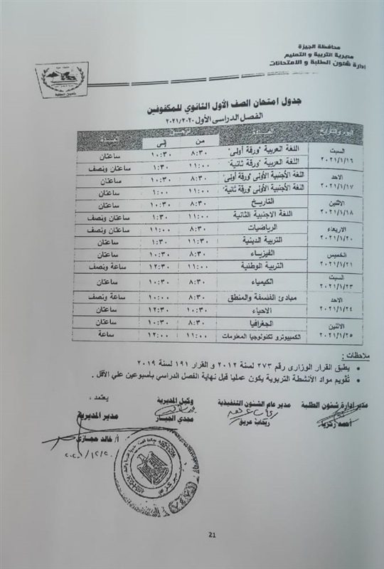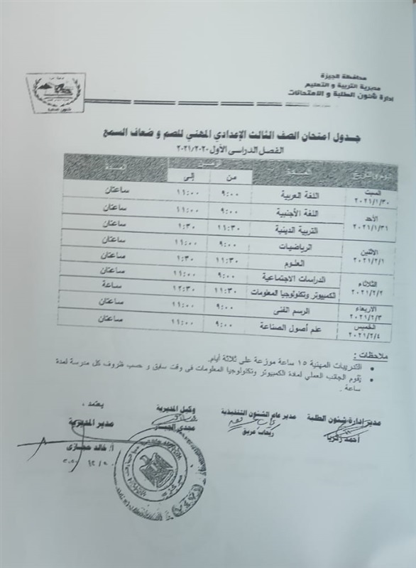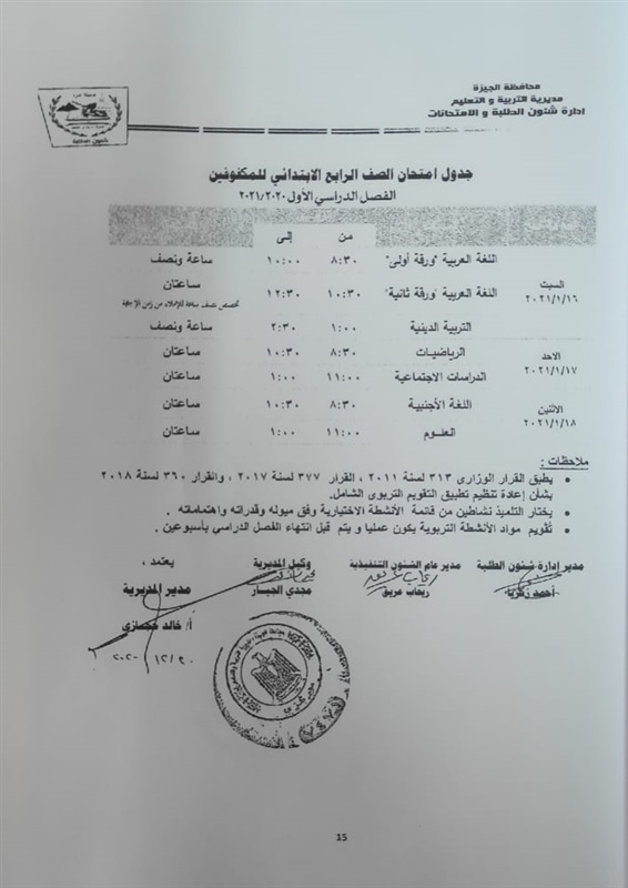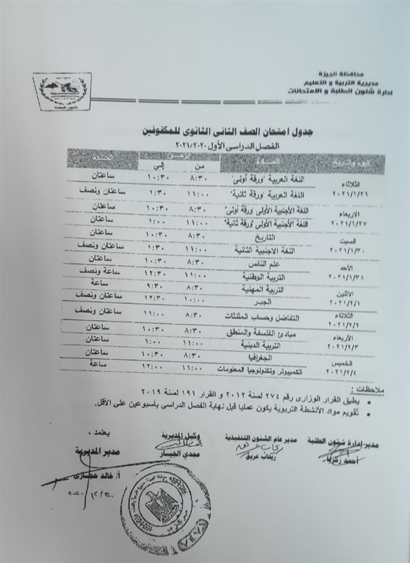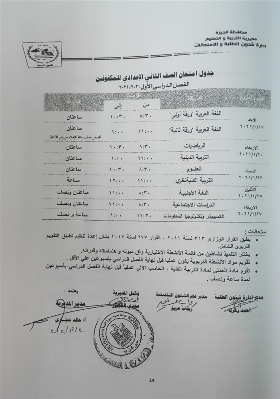 أعلنت مديرية التربية والتعليم في محافظة الجيزة جداول الامتحانات للفصل الدراسي الأول لكل الصفوف الدراسية للتعليم الاساسي العام عربي واللغات وللفترات الصباحية والمسائية والتعليم المهني والتعليم المجتمعي والصم وضعاف السمع والمكفوفين؛ للعام الدراسي 2020/2021.