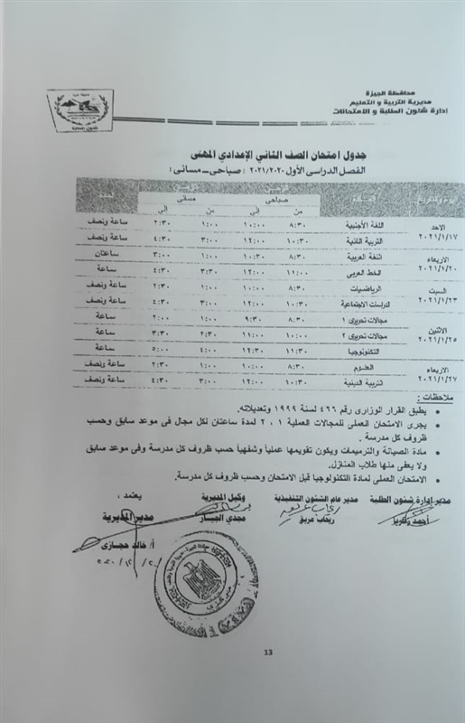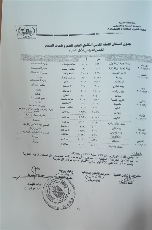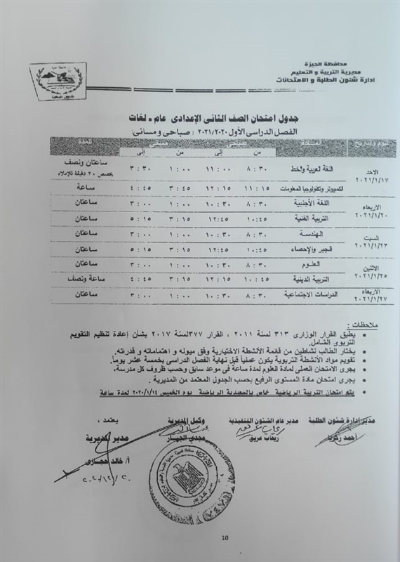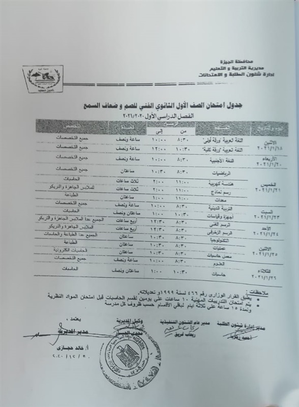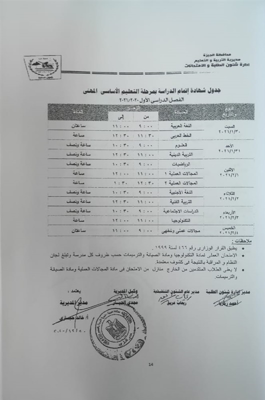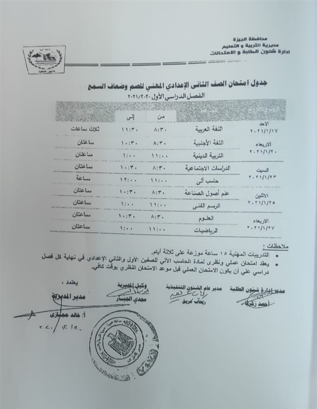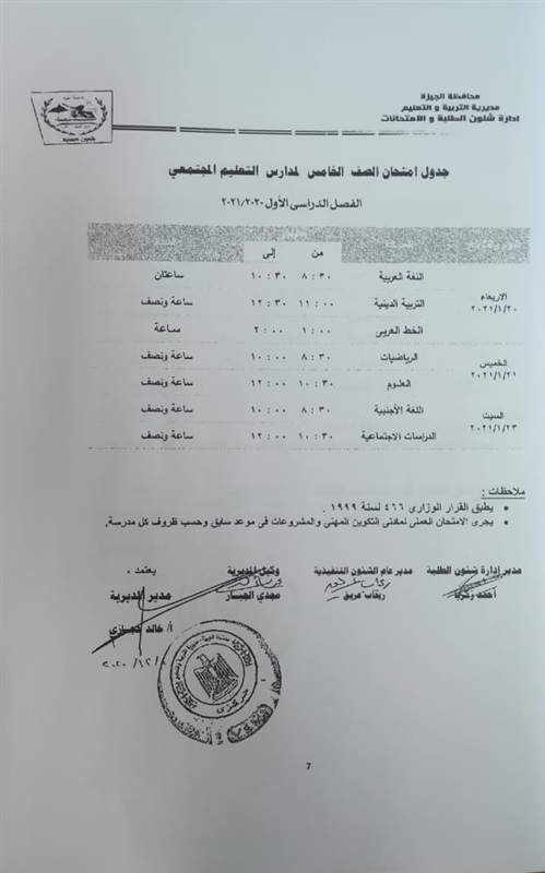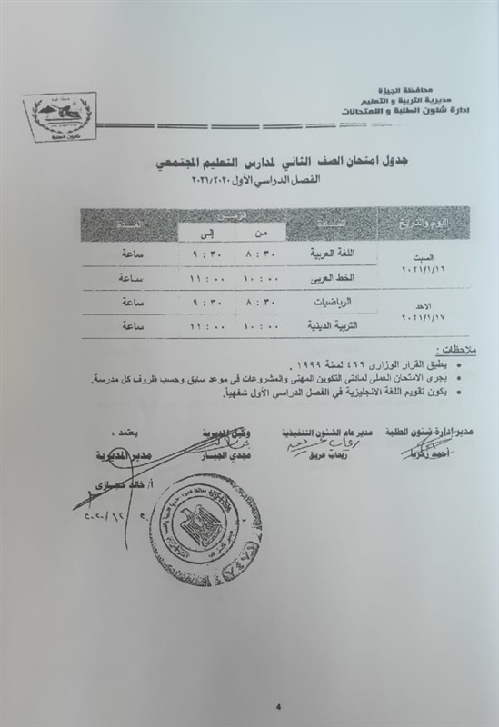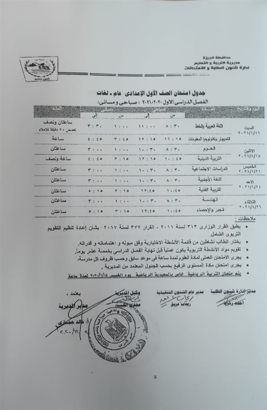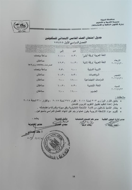 أعلنت مديرية التربية والتعليم في محافظة الجيزة جداول الامتحانات للفصل الدراسي الأول لكل الصفوف الدراسية للتعليم الاساسي العام عربي واللغات وللفترات الصباحية والمسائية والتعليم المهني والتعليم المجتمعي والصم وضعاف السمع والمكفوفين؛ للعام الدراسي 2020/2021.