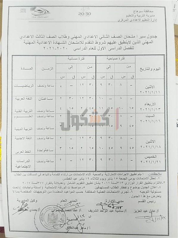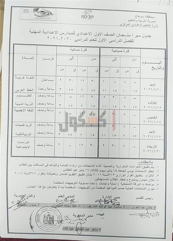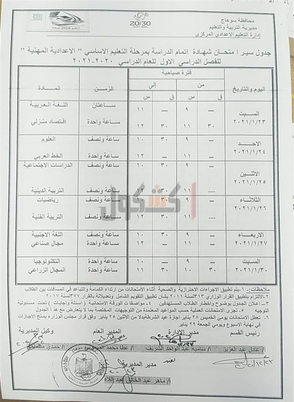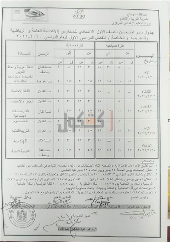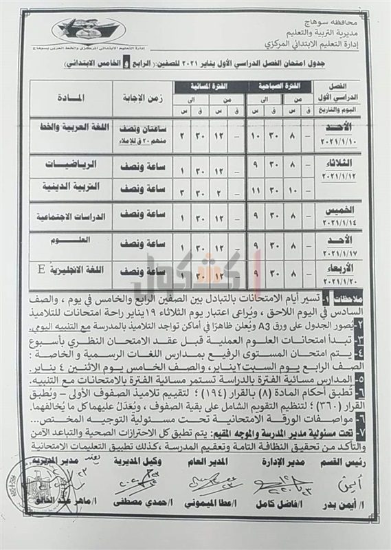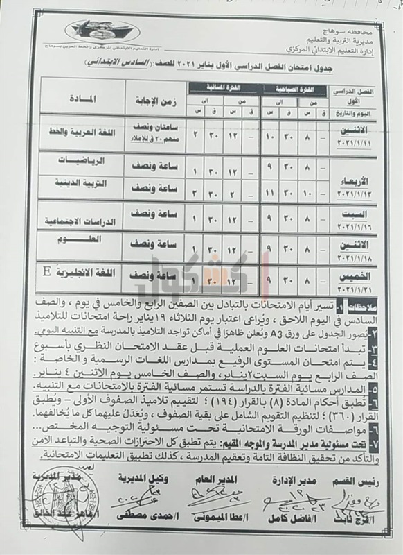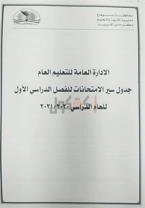 جدول امتحانات الفصل الدراسي الأول للمرحلتين الابتدائية والإعدادية بسوهاج