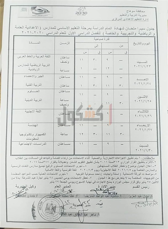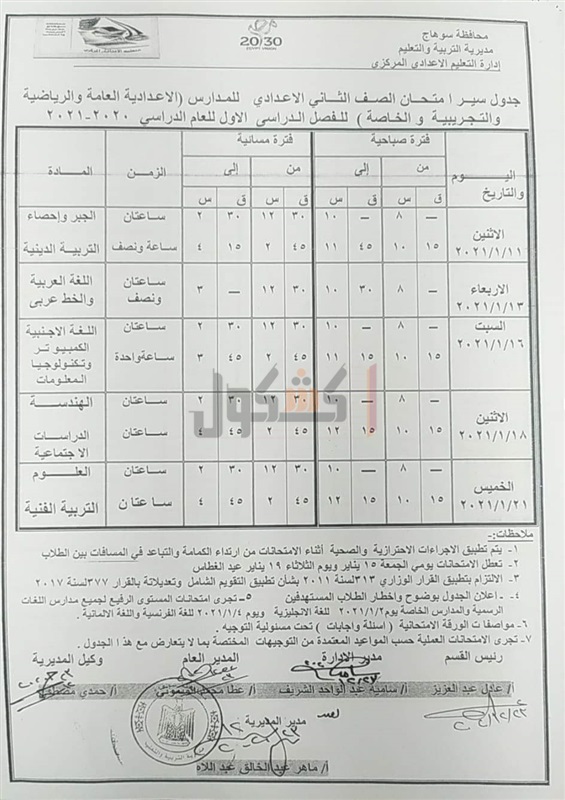 أعلنت مديرية التربية والتعليم بسوهاج جداول امتحانات الفصل الدراسي الأول للعام الدراسي يناير 2021 م، للمرحلتين الابتدائية والإعدادية.