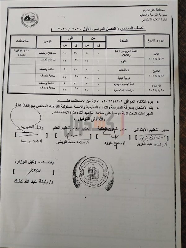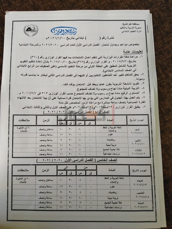 جدول امتحانات المرحلة الابتدائية بكفرالشيخ الفصل الدراسي الأول
