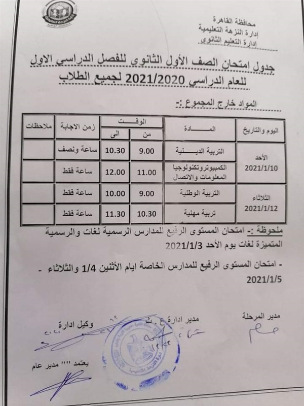 أعلنت مديرية التربية والتعليم، بمحافظة القاهرة، جدول امتحان الفصل الدراسي الأول للعام الدراسي 2020/2021 للصف الأول الثانوي؛ للمواد لا تضاف للمجموع.