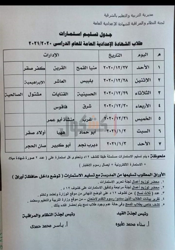 حددت مديرية التربية والتعليم والتعليم الفني في الشرقية جدول تسليم استمارات طلاب الشهادة الإعدادية للعام الدراسي 2020/2021
