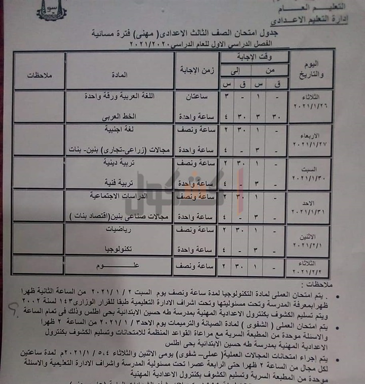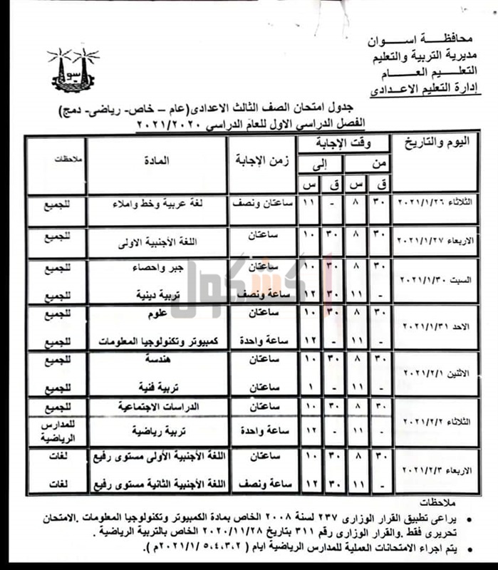 مدارس ننشر جدول الشهادة الإعدادية بأسوان محمود الشريف الخميس 24/ديسمبر/2020 - 08:23 م 12/24/2020 8:23:00 PM طباعة أعلنت مديرية التربية والتعليم بأسوان، جداول امتحانات الفصل الدراسى الأول للصف (الثالث الإعدادى) للعام الدراسى 2020/2021.وننشر لكم جدول الشهادة الإعدادية بأسوان. facebook twitter whats شارك