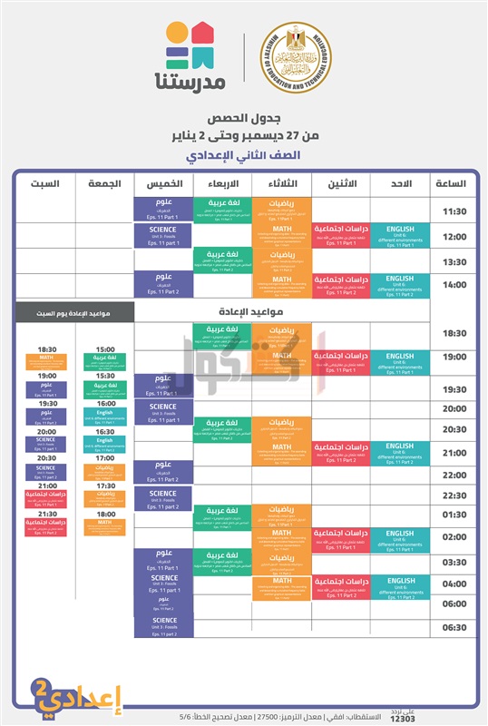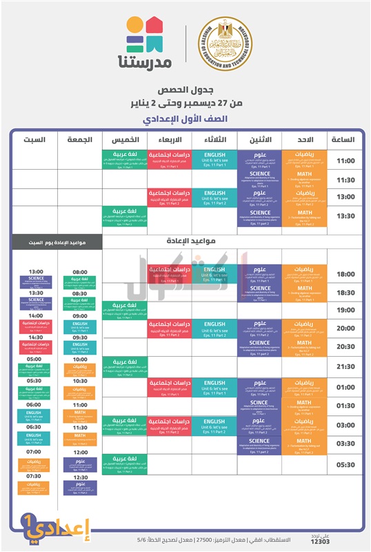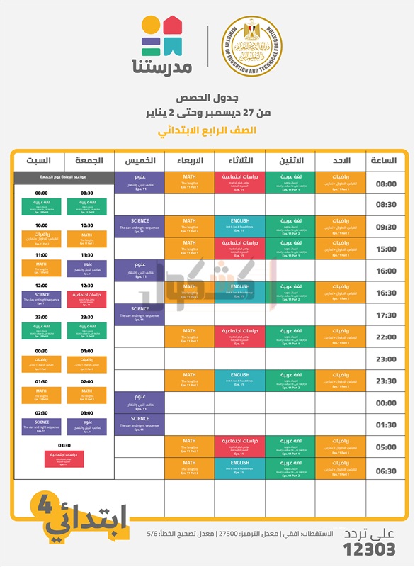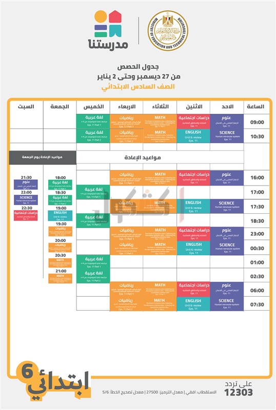 أعلنت وزارة التربية والتعليم اليوم جداول الأسبوع الحادي عشر لعرض الحصص التعليمية للمواد الأساسية (المواد داخل المجموع) من الصف الرابع الابتدائي حتى الثالث الإعدادي على القناة التعليمية "مدرستنا”، وذلك في الفترة من يوم الأحد ٢٧ ديسمبر حتى السبت ٢ يناير ٢٠٢٠.
