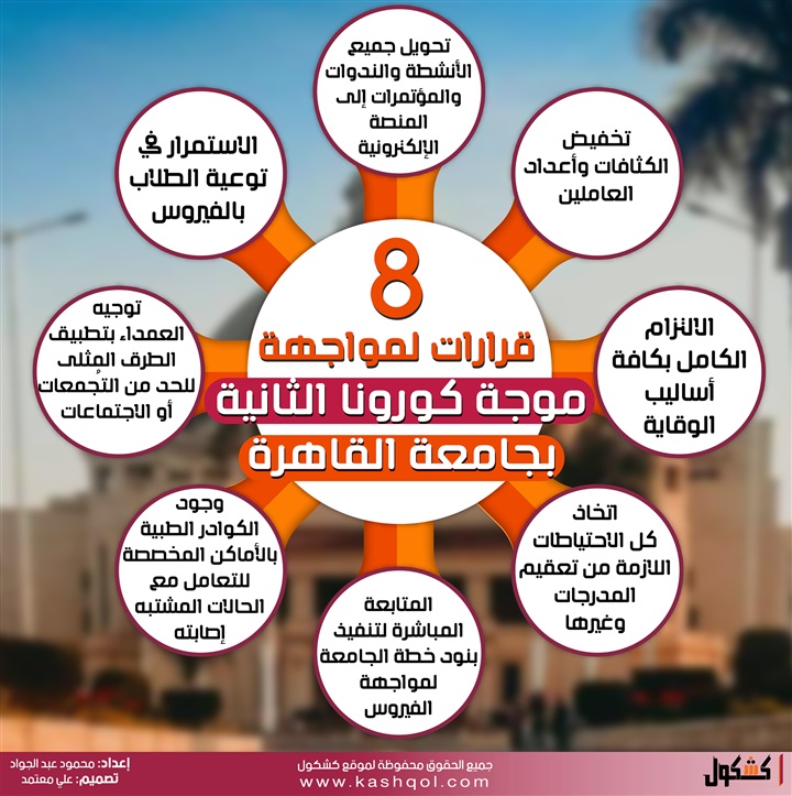 جراف 8 قرارات لمواجهة موجة كورونا الثانية بجامعة القاهرة محمود عبد الجواد الإثنين 28/ديسمبر/2020 - 02:13 م 12/28/2020 2:13:00 PM أرشيفية طباعة facebook twitter whats شارك