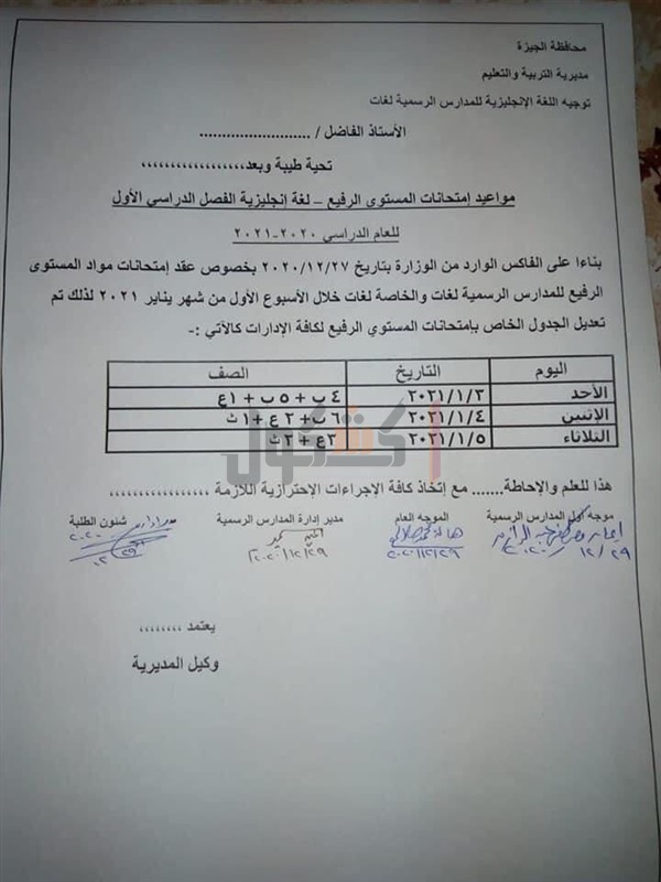 يذكر أن امتحانات الفصل الدراسي الأول للعام ٢٠٢٠/ ٢٠٢١ سوف تنطلق يوم ١٠ يناير القادم علي أن تنتهي قبل ٦ فبراير موعد بدء أجازة نصف العام الدراسي.