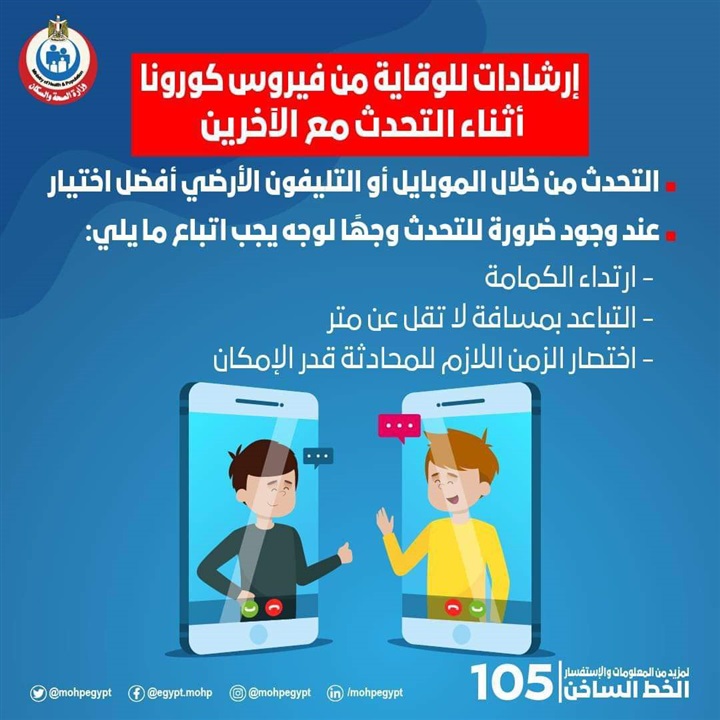 قدمت وزارة الصحة والسكان، عبر صفحتها الرسمية على موقع التواصل الاجتماعي«الفيسبوك» إرشادات للوقاية من فيروس كورونا أثناء التحدث مع الآخرين .