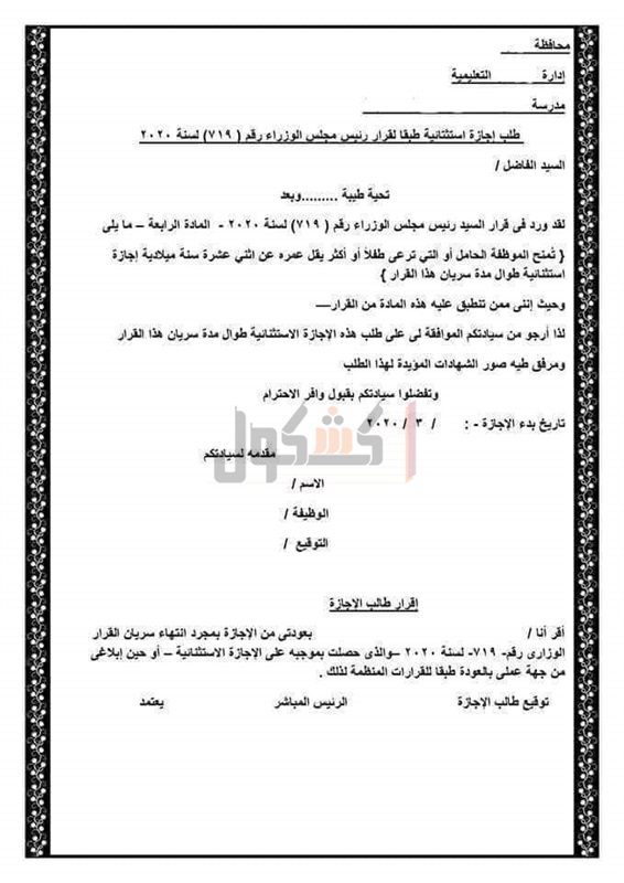 حصل كشكول علي صورة لشكل استمارة طلب أجازة الاستثنائية للعاملين في وظائف التعليم قبل الجامعي خلال الفترة المقبلة بسبب ذروة انتشار جائحة كورونا.
