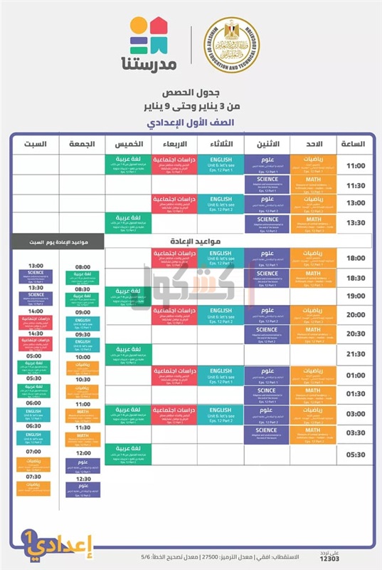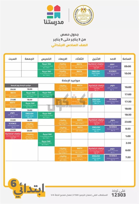 أعلنت وزارة التربية والتعليم اليوم جداول الأسبوع الثاني عشر لعرض الحصص التعليمية للمواد الأساسية (المواد داخل المجموع) من الصف الرابع الابتدائي حتى الثالث الإعدادي على القناة التعليمية "مدرستنا”، وذلك في الفترة من يوم الأحد ٣ يناير حتى السبت ٩ يناير ٢٠٢١.
