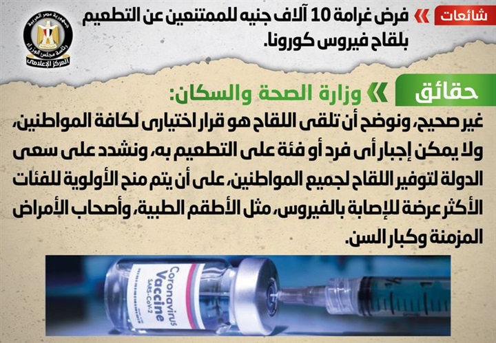 نفى المركز الإعلامي لرئاسة الوزراء صحة ما انتشر على صفحات التواصل الاجتماعي من أنباء بشأن فرض غرامة 10 آلاف جنيه للممتنعين عن التطعيم بلقاح فيروس كورونا.