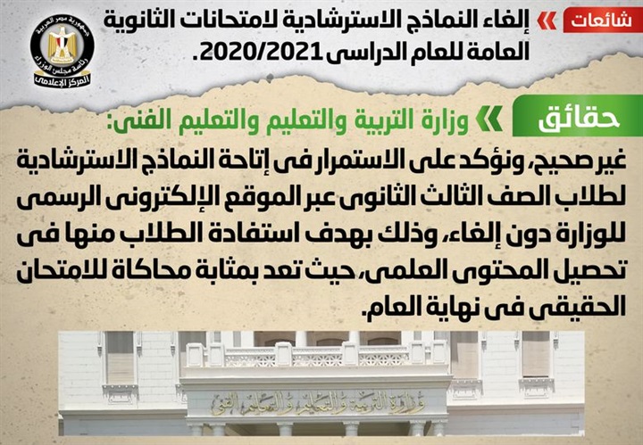 انتشر في بعض المواقع الإلكترونية وصفحات التواصل الاجتماعي أنباء بشأن إلغاء النماذج الاسترشادية لامتحانات الثانوية العامة للعام الدراسي 2020/2021، وقد قام المركز الإعلامي لمجلس الوزراء بالتواصل مع وزارة التربية والتعليم والتعليم الفني، والتي نفت تلك الأنباء، مُؤكدةً أنه لا صحة لإلغاء النماذج الاسترشادية لامتحانات الثانوية العامة للعام الدراسي 2020/2021، مُوضحةً الاستمرار في إتاحة النماذج الاسترشادية لطلاب الصف الثالث الثانوي عبر الموقع الإلكتروني الرسمي للوزارة دون إلغاء، وذلك بهدف استفادة الطلاب منها في تحصيل المحتوى العلمي، حيث تعد بمثابة محاكاة للامتحان الحقيقي في نهاية العام.
