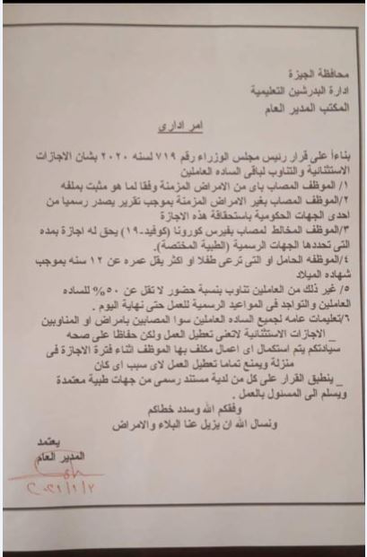 أصدرت إدارة البدرشين التعليمية بمحافظة الجيزة، قراراً إدراياً بناء على قرار رئيس مجلس الوزراء رقم 719 لسنة 2020، بشأن الاجازات