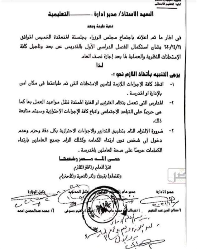 أصدرت مديريات التربية والتعليم، تنبيهًا هامًا للادارات التعليمية، وفقًا لما تم إعلانه باجتماع مجلس الوزراء الخميس الماضي، بشأن استكمال الفصل الدراسي الأول بالتدريس عن بعد وتأجيل كافة الامتحانات النظرية والعملية لما بعد إجازة نصف العام.