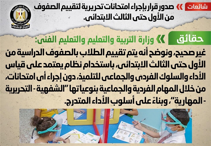 نفي المركز الإعلامي لمجلس الوزراء صحة الاخبار المتداولة علي بعض المواقع الإلكترونية، بشأن إجراء امتحانات تحريرية لتقييم الصفوف من الأول حتى الثالث الابتدائي .
