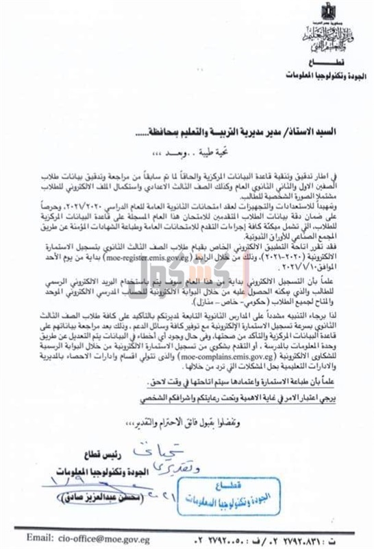 في خطابها: «تمهيدا لتجهيزات امتحانات الثانوية العامة للعام الدراسي ٢٠٢٠٢٠٢١ وحرصا