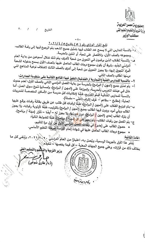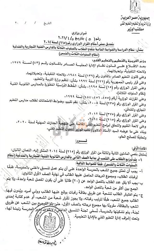 الفني، قرار وزاري رقم 5 بتاريخ 5 يناير 2021 بشأن نظام الدراسة والضوابط الخاصة