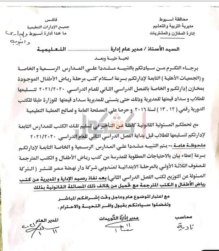 وجهت مديرية التربية والتعليم والتعليم الفني بأسيوط، بضرورة التنبيه علي المدارس الرسمية والخاصة والجمعيات الاهلية بسرعة استلام كتب مرحلة رياض الأطفال الخاصة بالفصل الدراسي الثاني، لتسليمها للطلاب وسداد قيمتها للمديرية.