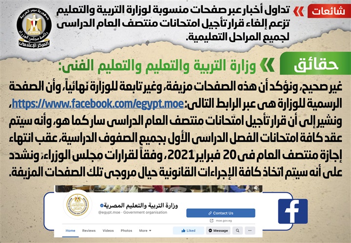 للوزارة نهائيًا، وأن الصفحة الرسمية للوزارة هي عبر الرابط https:www.facebook.comegypt.moe، مُشيرةً إلى أن قرار تأجيل امتحانات منتصف العام الدراسي سارٍ كما