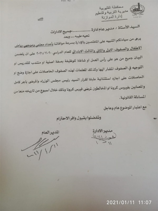 وأكدت المديرية، على أن يتضمن البيان جميع من هم على رأس العمل او شاغلآ للوظيفة بصفة أصلية او منتدب للتدريس او التوجيه في الصفوف المشار إليها، وكذلك المعلمات لهذه الصفوف الحاصلات على اجازة وضع او الحاصلات على اجازة استثنائية طبقا لقرار رئيس مجلس الوزراء والمرضي بأجر كامل، والمصابين بفيروس كورونا، او المخالطين لمرضى فيروس كورونا.