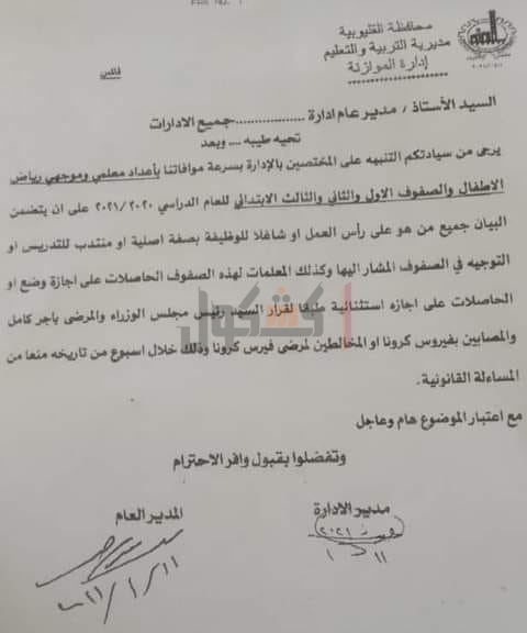 بمحافظة القليوبية تنبيه للمختصين بسرعة موافاتها بأعداد معلمي وموجهي رياض