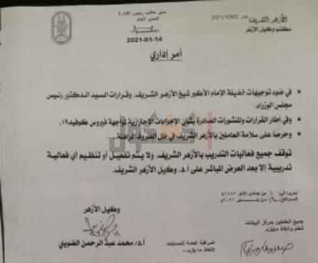 ونص قرار وكيل الأزهر، على أن القرار يأتي في ضوء قرارات فضيلة الإمام الأكبر الدكتور أحمد الطيب شيخ ىالأزهر، والدكتور مصطفى مدبولي رئيس مجلس الوزراء، وفي ضوء القرارات الصادرة بشأن الإجراءات الاحترازية لمواجهة فيروس كورونا، وحرصا على سلامة العاملين بالأزهر في ظل الظروف الراهنة.