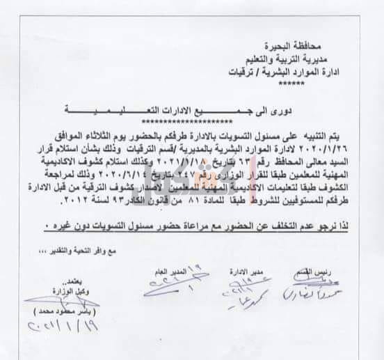 تنبيه مهم لمسئولي التسويات بالإدارات التعليمية في البحيرة