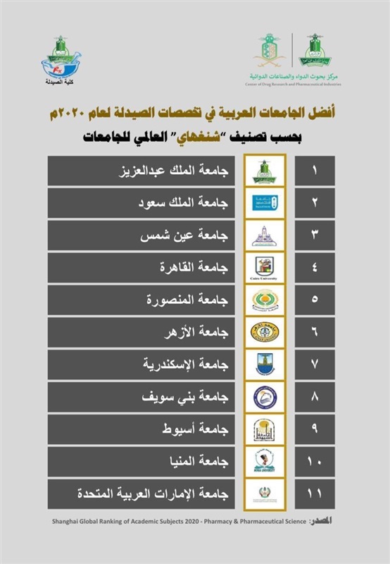 وحصلت كلية الصيدلة بجامعة عين شمس على المركز الأولى بين الجامعة المصرية، وتلتها جامعات "القاهرة والمنصورة والأزهر والإسكندرية وبني سويف وأسيوط والمنيا"