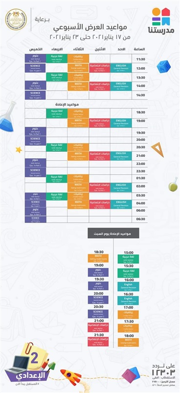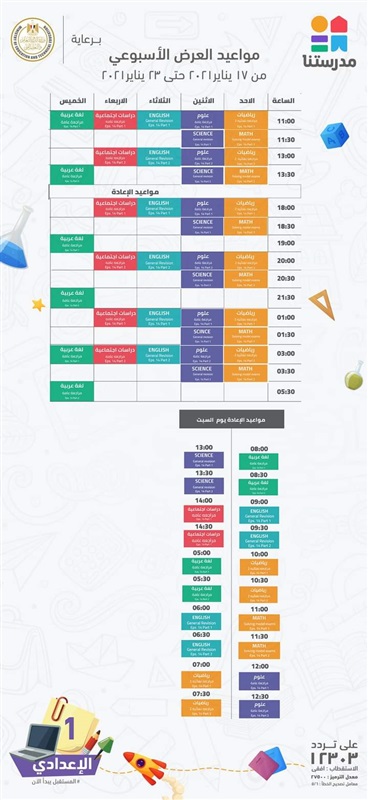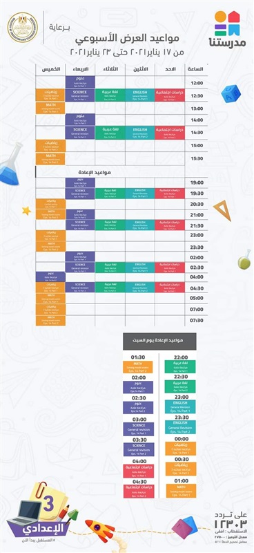 ويمكن لطلاب الصف الأول والثاني والثالث الإعدادي، معرفة مواعيد إعادة دروس الأسبوع اليوم السبت، والتي تبدأ في الثامنة صباحًا، على قناة مدرستنا، على التردد 12303 أفقي، والمواعيد هي: