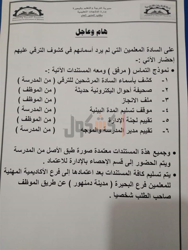 وجهت مديرية التربية والتعليم في البحيرة؛ المعلمين التي لم ترد أسمائهم في كشوف الترقي ضرورة احضار الآتي:
