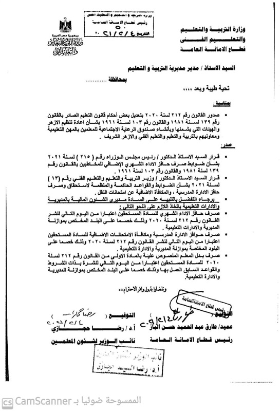 ينشر موقع كشكول صورة من خطاب وزارة التربية والتعليم والتعليم الفني إلى المديريات التعليمية، بشأن قرار الدكتور رئيس مجلس الوزراء رقم (215) لسنة2021 بشأن ضوابط صرف حافز الأداء الشهرى الإضافى للمخاطبين بالقانون رقم 139 لسنة 1981 والقانون رقم 103 لسنة 1961، وقرار الدكتور طارق شوقى وزير التربية والتعليم والتعليم الفنى رقم (13) لسنة 2021 الخاص بالضوابط والقواعد الحاكمة والمنظمة لاستحقاق وصرف حافز الإدارة المدرسية، والمكافأة الإضافية عن امتحانات النقل.