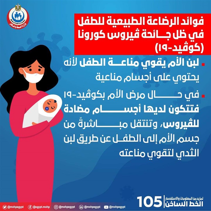 ونشرت "الصحة" عبر حسابها الرسمي على موقع التواصل الاجتماعي، "الفيس بوك"، فوائد الرضاعة الطبيعية في ظل جائحة فيروس كورونا.