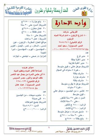 مخازن براتب 3450 جنيه ، و 20 عامل نظافة براتب 2400 جنيه ، و 50 مندوب مبيعات براتب