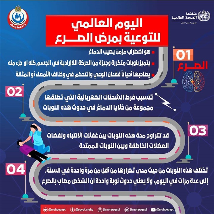 فقالت الصحة في منشور توعوي لها، عبر صفحتها الرسمية على موقع التواصل الاجتماعي" الفيس بوك"، إن الصرع هو اضطراب مزمن يصيب الدماغ، ويتميز بنوبات متكررة وجيزة من الحركة اللاإرادية في الجسم كله أو جزء منه، بالإضافة إلي أنه يصاحبها أحيانا فقدان الوعي والتحكم في وظائف الأمعاء أو المثانة.