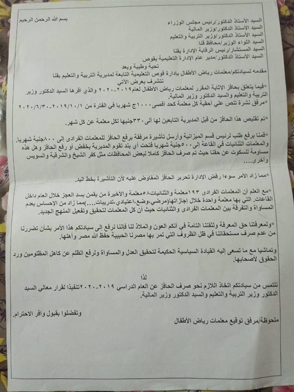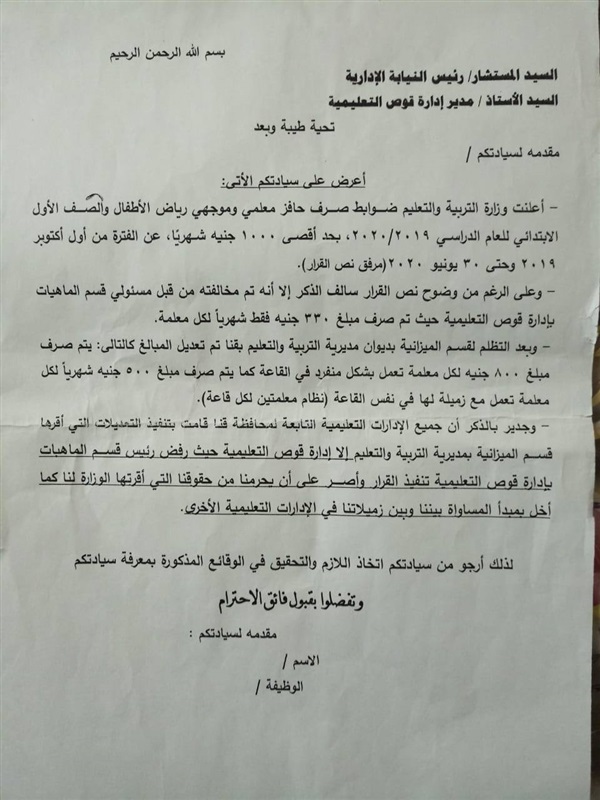 ادارة قوص التعليمية خالفت ضوابط صرف الحافز عن الفترة من أول أكتوبر 2019 حتى 30