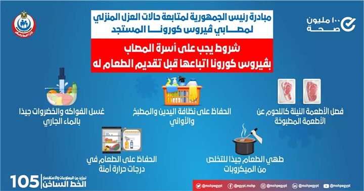 وقالت "الصحة" عبر حسابها الرسمي على موقع التواصل الاجتماعي "فيس بوك"، إن هناك شروط يجب على أسرة المصاب بفيروس كورونا اتباعها قبل تقديم الطعام له.