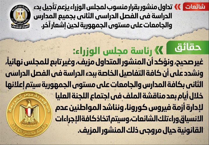 وكانت العديد من صفحات السوشيال ميديا، قد تداولت في الساعات الأخيرة منشور مزيف منسوب لمجلس الوزراء بشأن تأجيل الدراسة.