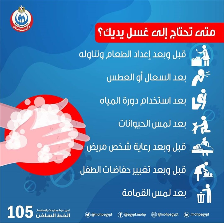 كشفت وزارة الصحة والسكان، الأوقات التي يجب أن تقوم فيها بغسل يديك للوقاية من فيروس كورونا وغيره من الأمراض المعدية.