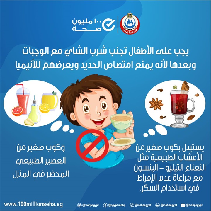 الأطفال تجنب شرب الشاي مع الوجبات أو بعدها لأنه يمنع امتصاص الحديد ويعرضهم لمشكلة